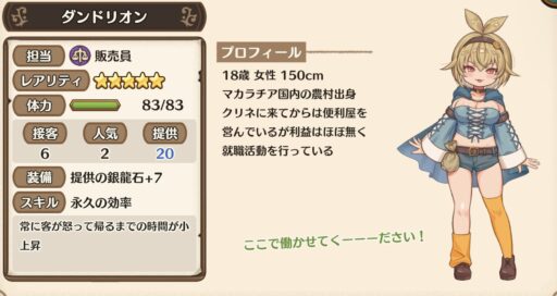 ステータス [人気] が現状では不要となっているため、お店レベルの高さとメニューに加える [需要] で客足が変わる今の私の状態に適したキャラです。